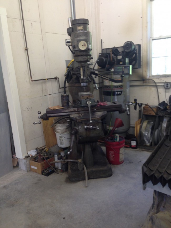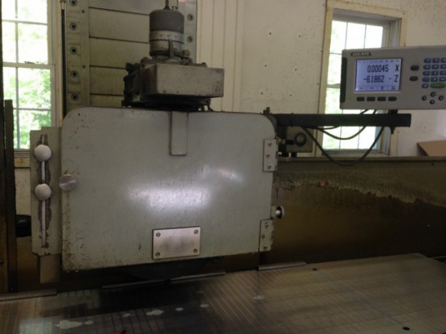 a stationary, abrasive, rotating wheel to shave or finish a metallic surface which is held in place